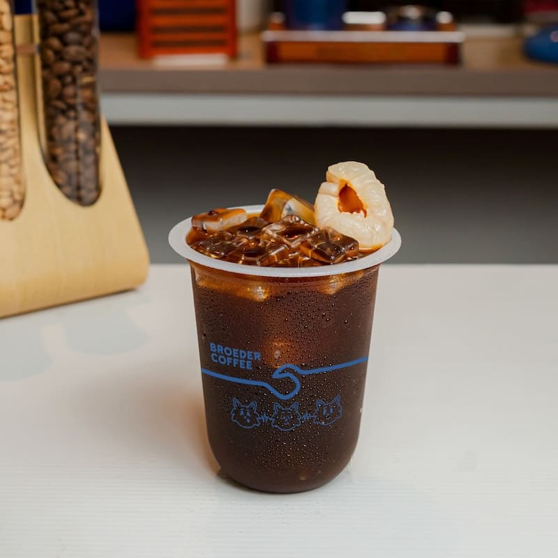 Kopi hitam dengan asam jawa dan buah lychee.